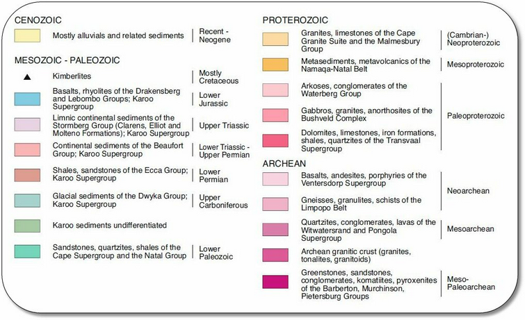 Geology can be described as the complex structure of rock formations, which occur in specific locations and sequences. Geology has a major influence on most other features of the landscape such as land form, soil, topography and vegetation. Large parts of the country are underlain by Precambrian rocks, including the Barberton and Murchison Belts, the Limpopo mobile belt and the Witwatersrand Supergroup, all of which are of Archean age. For the Transvaal Supergroup, the Bushveld Complex, the Vredefort Dome (an ancient meteorite impact structure) and the Waterberg (Mokolian) Supergroup a Paleoproterozoic age has been assigned. The Namaqualand Metamorphic Province is of Mesoproterozoic age. The lower Paleozoic is characterized by sediments and granites that were folded into the Cape Fold Belt. Approximately two thirds of South Africa's surface is covered by rocks of the Paleozoic to Mesozoic Karoo Supergroup, comprising mainly continental clastic sediments and volcanics. Several alkaline complexes, carbonatites and kimberlites, have intruded the Precambrian and Karoo strata. Cenozoic terrestrial and fresh water sediments, mainly sands of the Kalahari Group, cover large parts of northwestern South Africa along the borders with Botswana and Namibia. This section of the dictionary is divided as follows: 1. Pre-Karoo 1.1 Natal Group 1.2 Cape Supergroup 1.3 Malmesbury Supergroup and Cape Granite Suite 1.4 Namaqa-Natal Belt 1.5 Waterberg Supergroup 1.6 Bushveld Igeneous Complex 1.7 Transvaal Supergroup 1.8 Ventersdorp Supergroup 1.9 Limpopo Belt 1.10 Witwatersrand Supergroup 1.11 Pietersburg Group 1.12 Barberton Murchinson 2. Karoo Supergroup 2.1 Sedimentary Deposits 2.2 Dolerite Intrusions 3. Post-Karoo 3.1 Drakensberg and Lebombo Group 3.2 Tertiary Deposits 3.3 Kimberlite Intrusions 4. Minerals 5. Rocks Minerals and Rocks are summarised from Environmental Geology Practical Notes (GLG242) written by Michael Bester