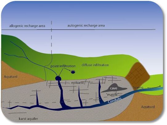 Definition Limestone and dolomite areas that possess a topography peculiar to and dependent upon underground solution and the diversion of surface waters to underground routes. Description The term karst is used to describe an area of limestone or other highly soluble rock, in which the landforms are of dominantly solutional origin and in which the drainage is underground in solutionally enlarged fissures and conduits (caves). Why is a karst aquifer important? Karst processes significantly change the flow, transport and storage behaviour of groundwater in such systems. Karst groundwater can be particularly vulnerable to pollution.