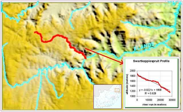 This example shows a river profile for the Swartkoppiespruit in Mpumalanga. Moolman (unpublished results) used the Arc/Info GRID application to calculate the profile of this river from the national digital elevation model. This technique is rapid, but the 200 to 400 metre grid resolution places a limit on its accuracy.