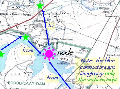 The node represented here in purple "knows" that the Edendale Spruit and Pienaars channels flow towards it, and that the Pienaars River downstream of the dam wall flows away from it.