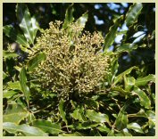 The fruits are much favoured by birds, and the leaves are used to treat ailments such as rheumatism and malaria. Seedlings only grow from seeds that passed through the digestive tracts of birds or other animals. Often propagated by nurseries, these trees make attractive garden plants but cannot tolerate severe frost. The bark is dark grey, longitudinally fissured, smooth and resinous.The leaves are compound digitate leaves with 3 to 5 oblong leaflets (9 to 18 cm long). The leaflets are leathery glossy and dark green above, paler beneath, with wavy or serrated margins, and clustered on long leaf stalks. The flowers are small, greenish-cream to yellowish, in umbles which are forming large bunches at the end of the branches. The fruit is dark red, small and round fruits borne in loose clusters. The wood is white or yellow, moderately soft, straight-grained and free of knots.