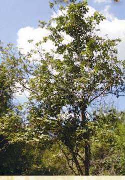 The wild plum may be confused with the Cape ash (Ekebergia capensis) but is distinguishable by its sickle-shaped leaflets and the leaves that are crowded towards the end of the branches. |