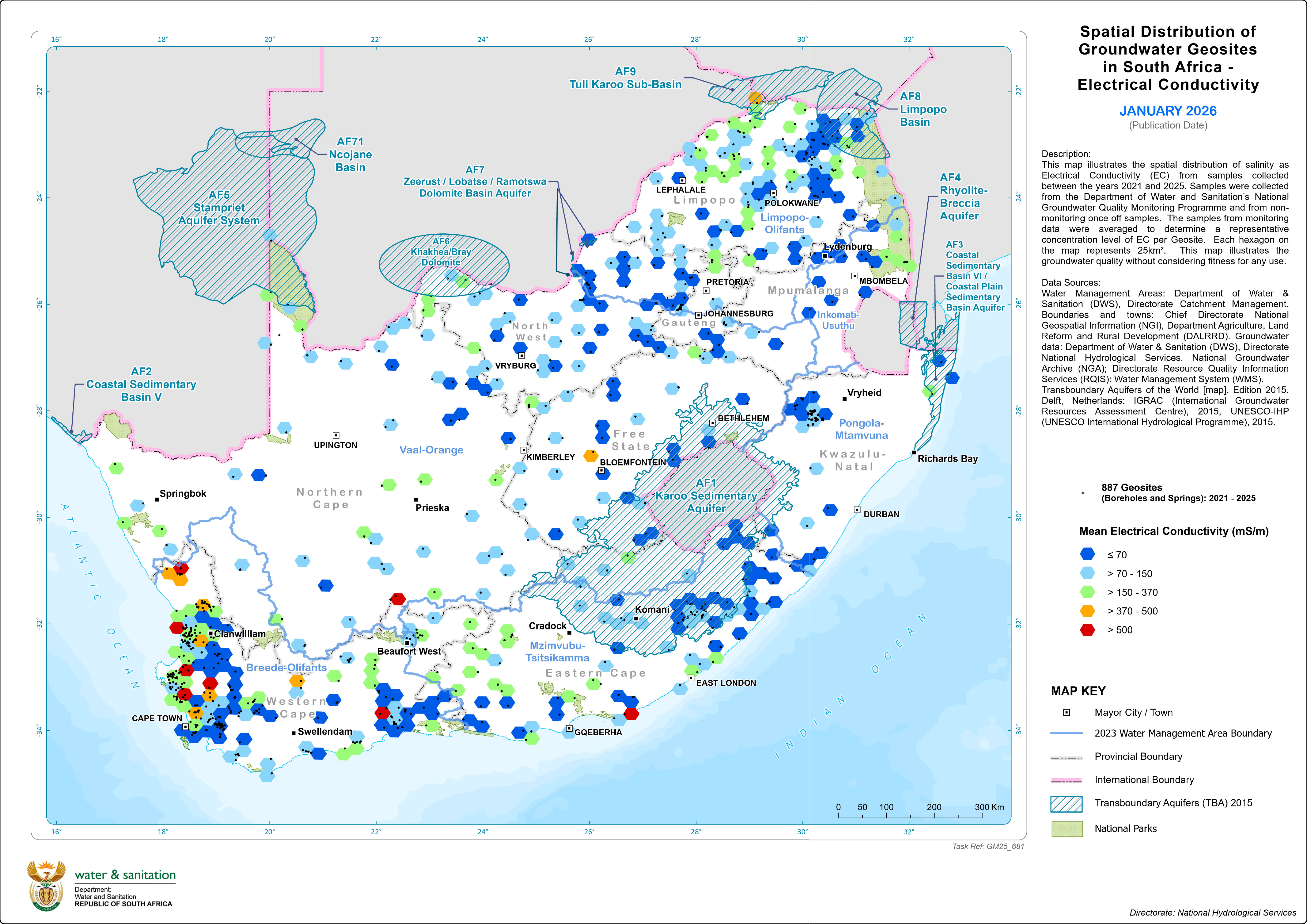 This map illustrates the spatial distribution of salinity as Electrical Conductivity (EC) from samples collected from Geosites between the years 2021 and 2025. Samples were collected from the Department of Water and Sanitation’s National Groundwater Quality Monitoring Programme and from non-monitoring once off samples. The samples from monitoring data were averaged to determine a representative concentration level of EC per Geosite. Each hexagon on the map represents 25km². This map depicts the groundwater quality without considering fitness for any use.