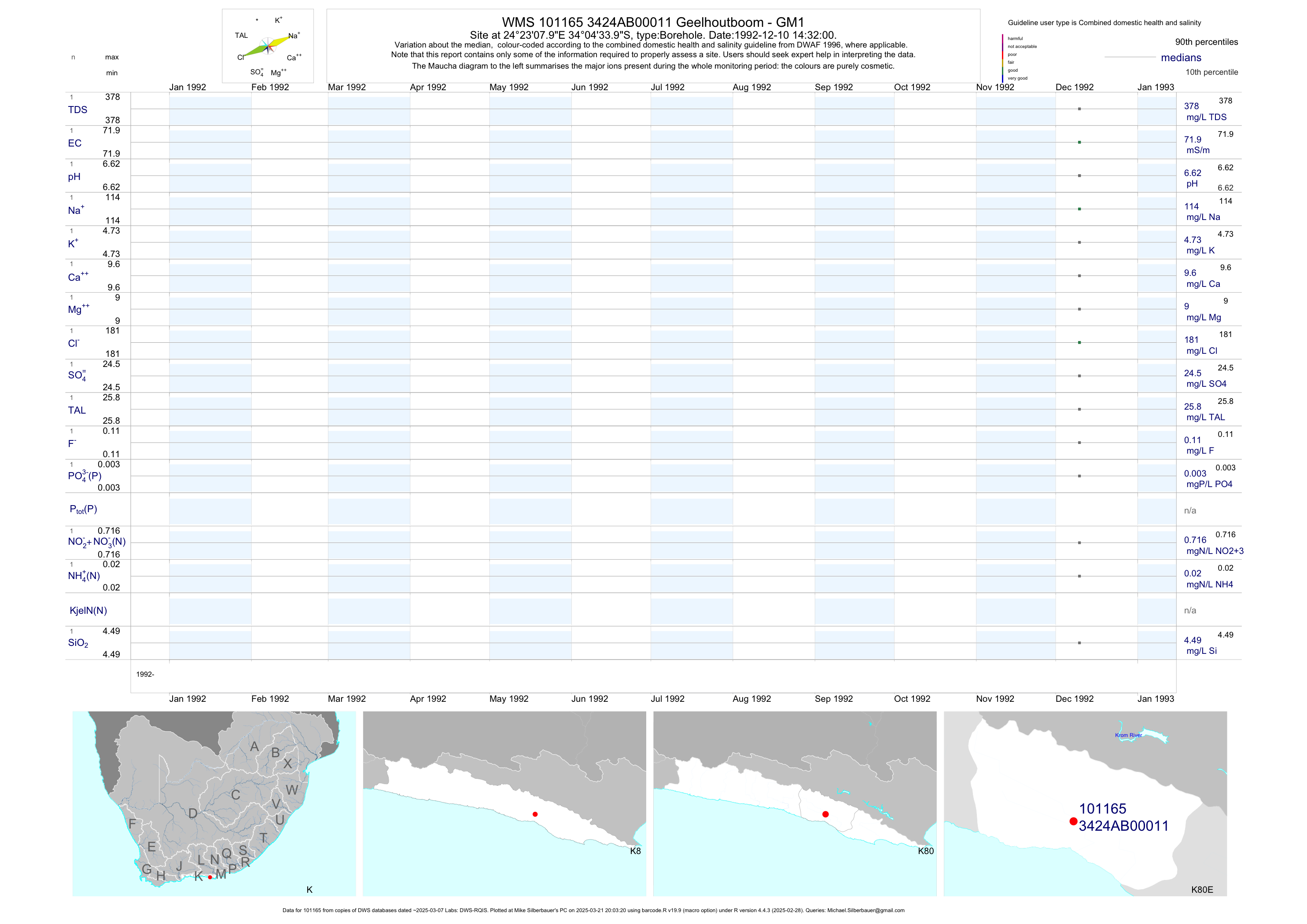 | K10 1000013653 | plot | data | Duinzigt - GZ00193 | Borehole | 2 | 2006-01-17 | 2006-01-17 | 297 | 114 | -34.16200 | 21.97858 |