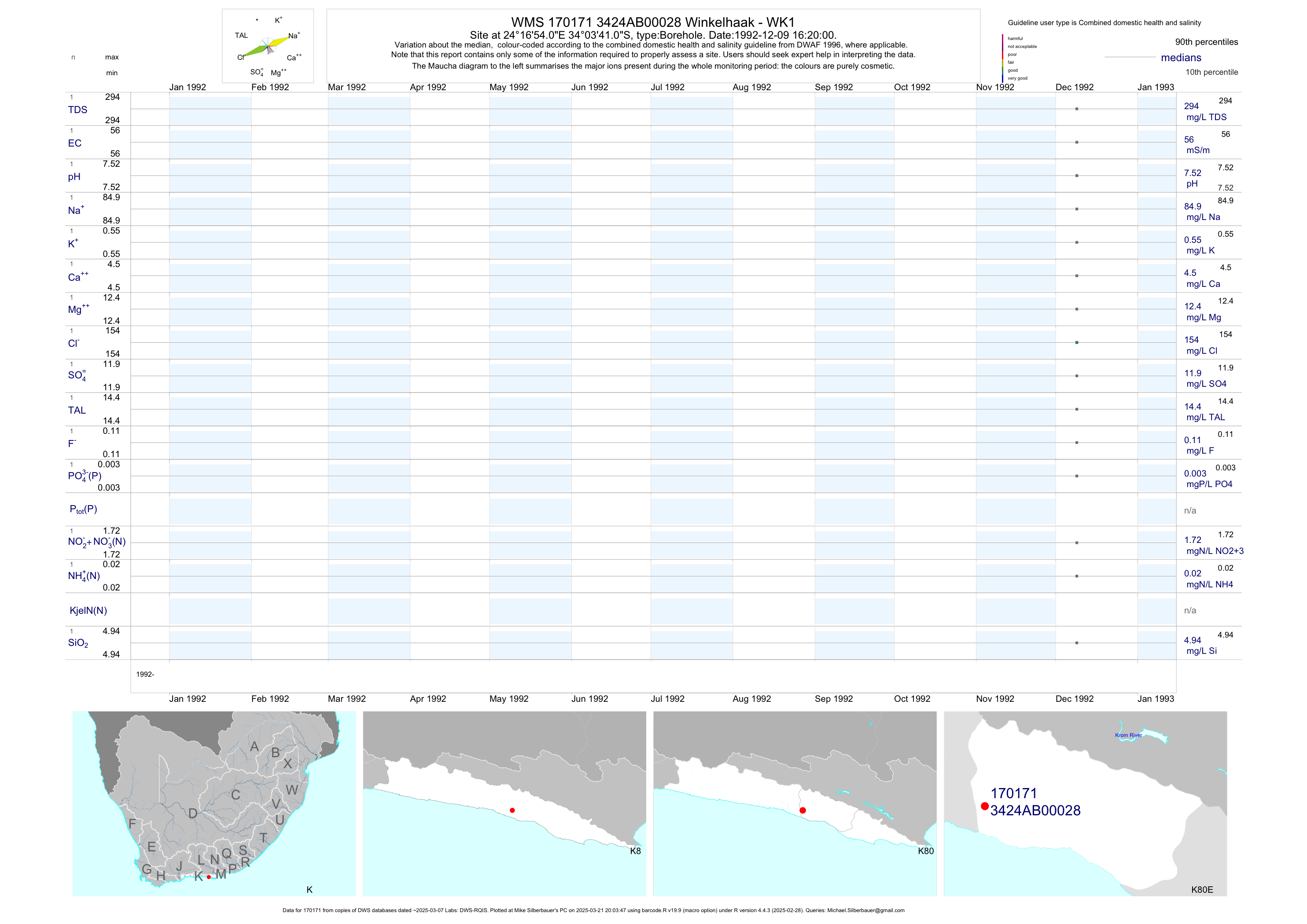 | K90 171927 | plot | data | Sunnyside Part of Mentorskraal (dup name 27693) | Borehole | 3 | 1994-01-26 | 1994-02-01 | 287 | 171927 | -34.02694 | 24.86917 |
