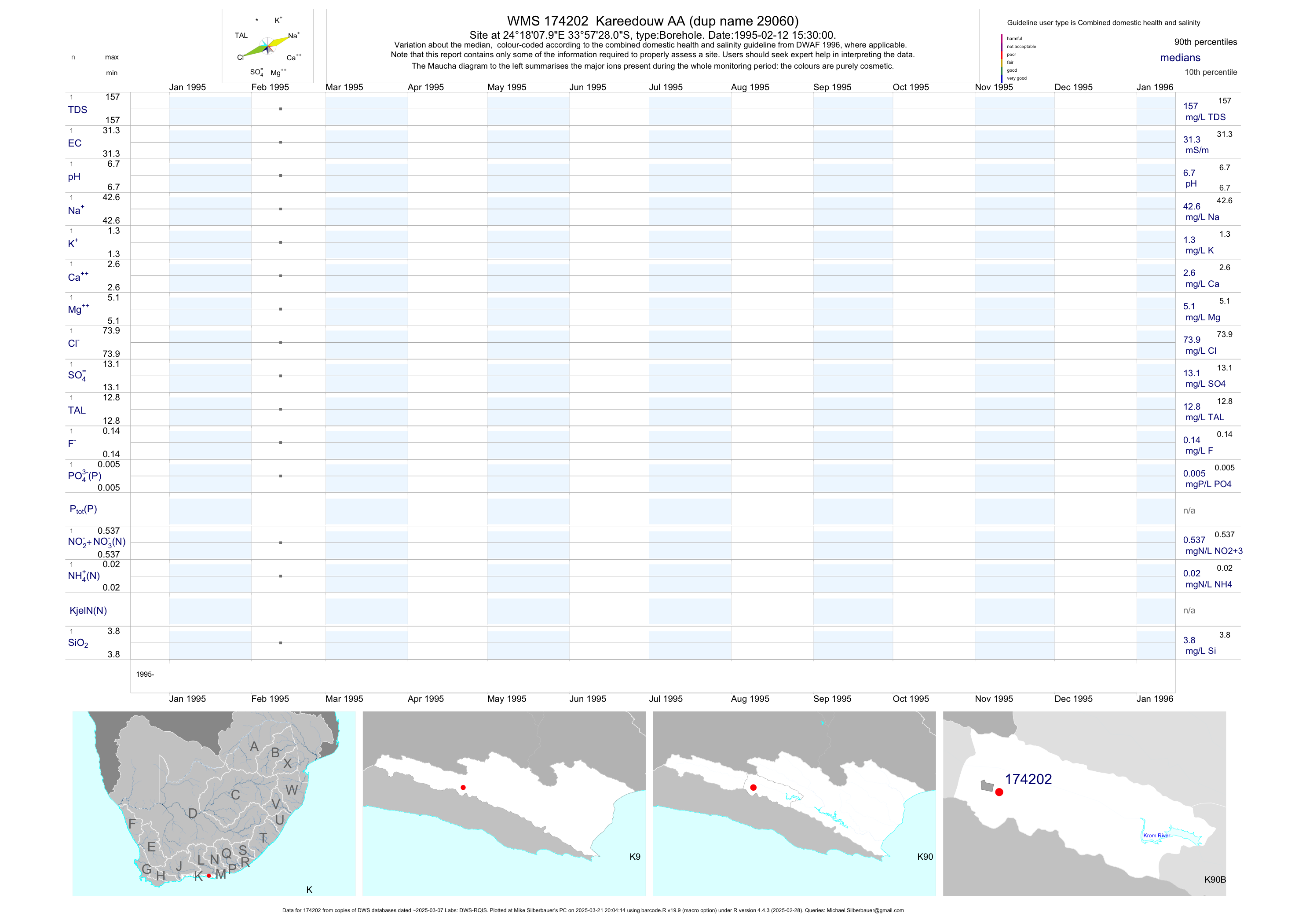 | K90 174203 | plot | data | Kareedouw AA (dup name 29061) | Borehole | 2 | 1995-02-12 | 1995-02-12 | 31 | 174203 | -33.95722 | 24.30139 |