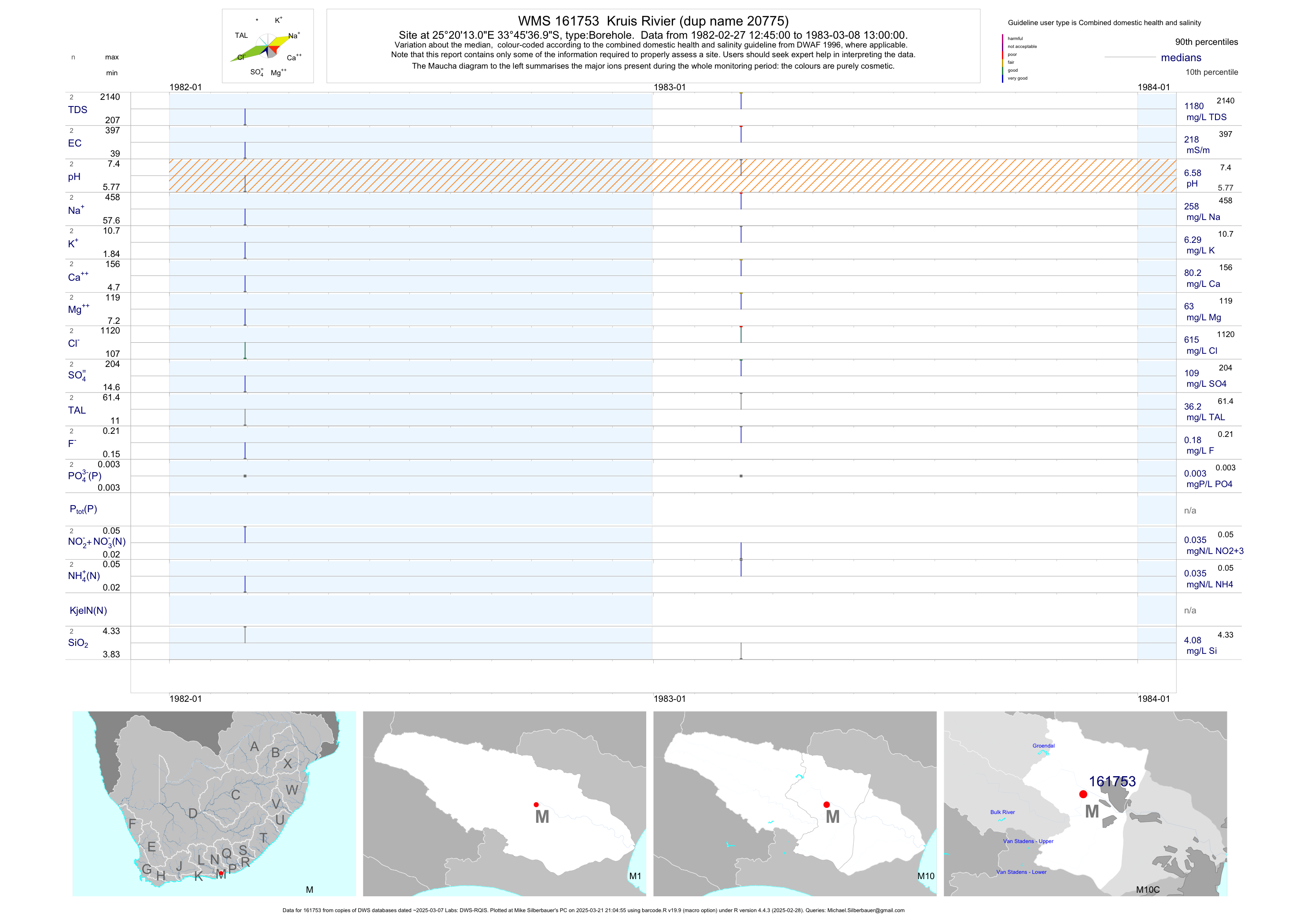 | M10 161739 | plot | data | Kruis Rivier (dup name 20761) | Borehole | 1 | 1982-02-22 | 1982-02-22 | 416 | 161739 | -33.77083 | 25.33056 |