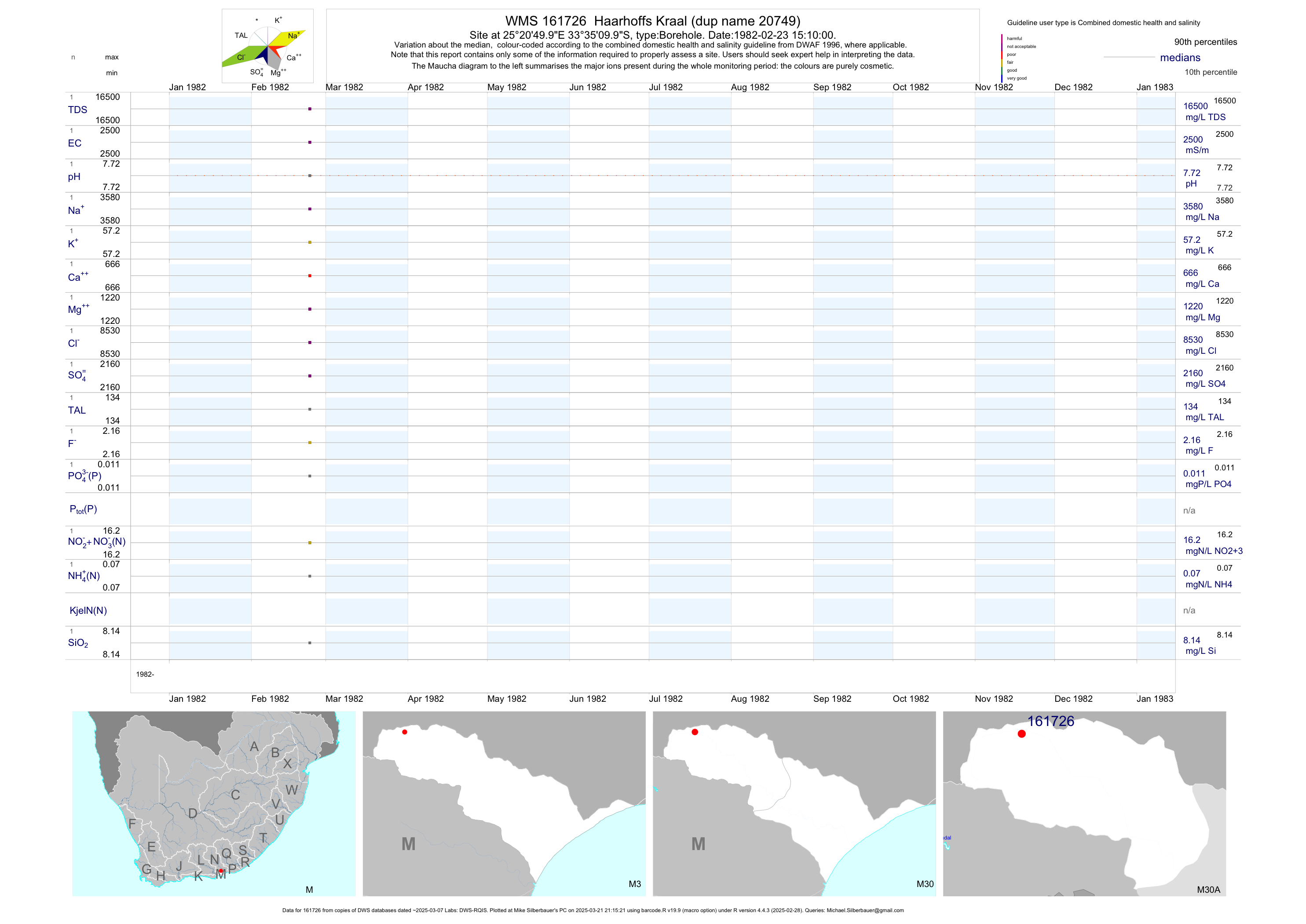 | M30 161725 | plot | data | Haarhoffs Kraal (dup name 20748) | Borehole | 1 | 1982-02-23 | 1982-02-23 | 199 | 161725 | -33.58194 | 25.34722 |