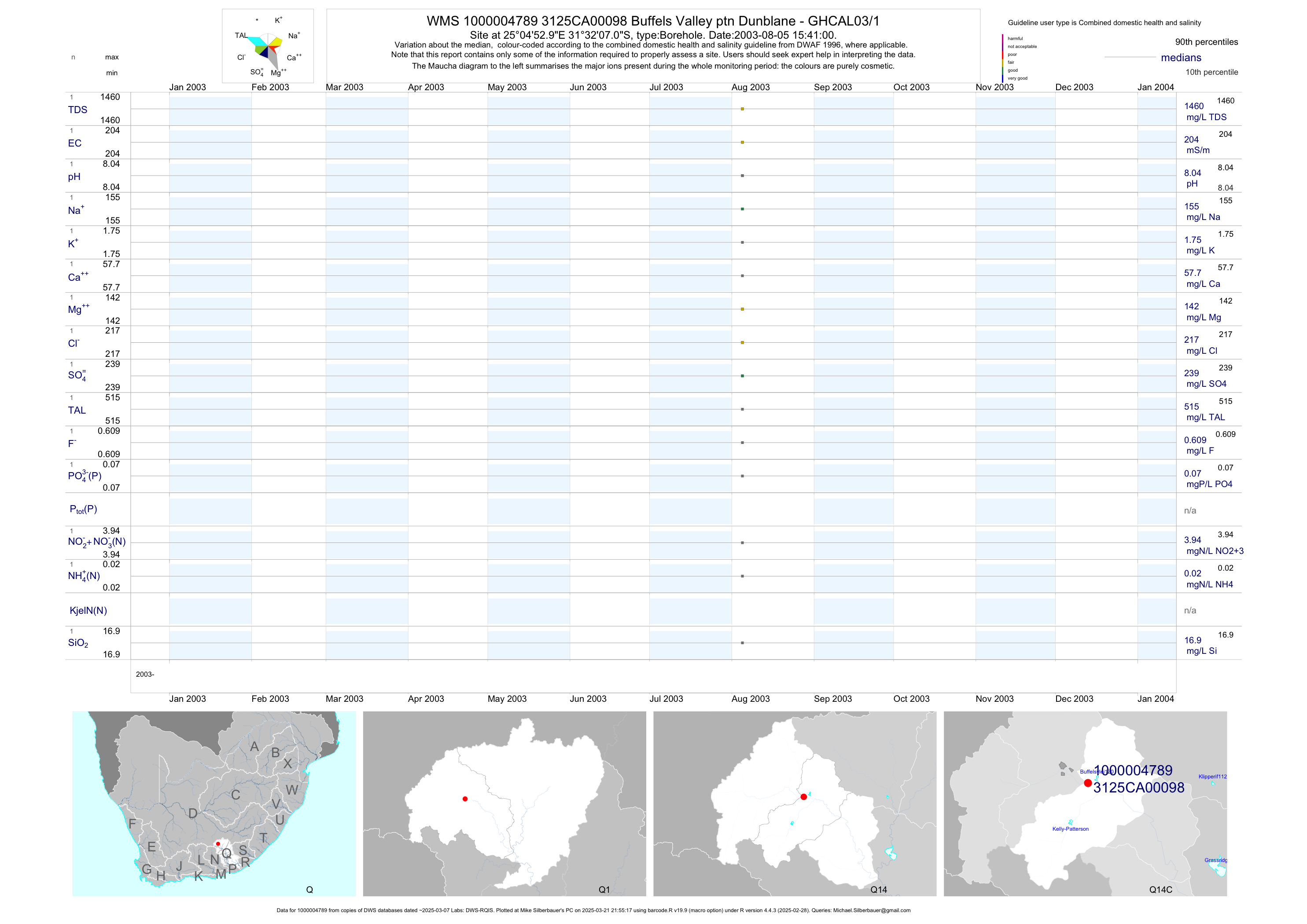 | Q14 1000004789 | plot | data | Buffels Valley ptn Dunblane - GHCAL03/1 | Borehole | 2 | 2003-08-05 | 2003-08-05 | 204 | 98 | -31.53528 | 25.08139 |