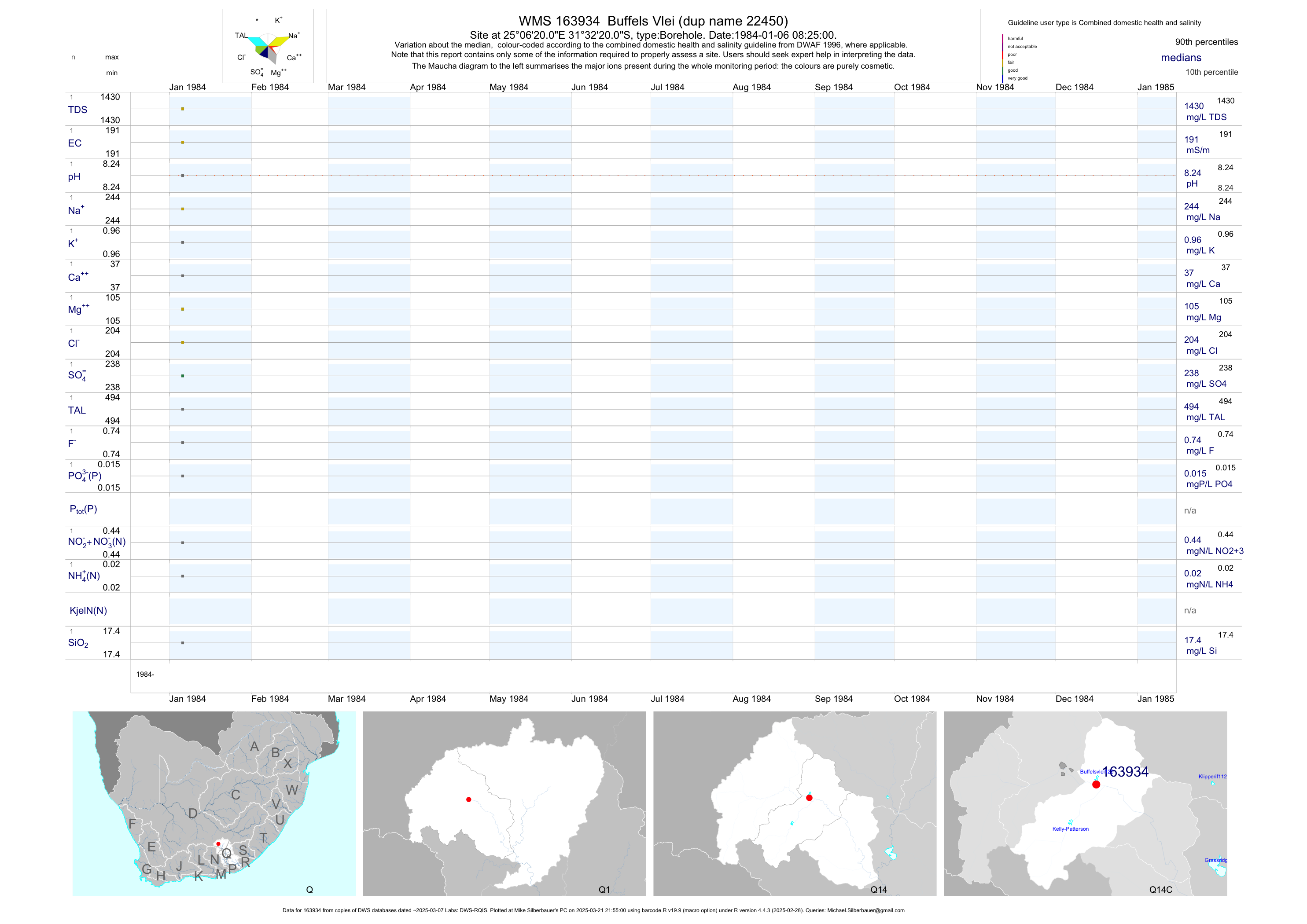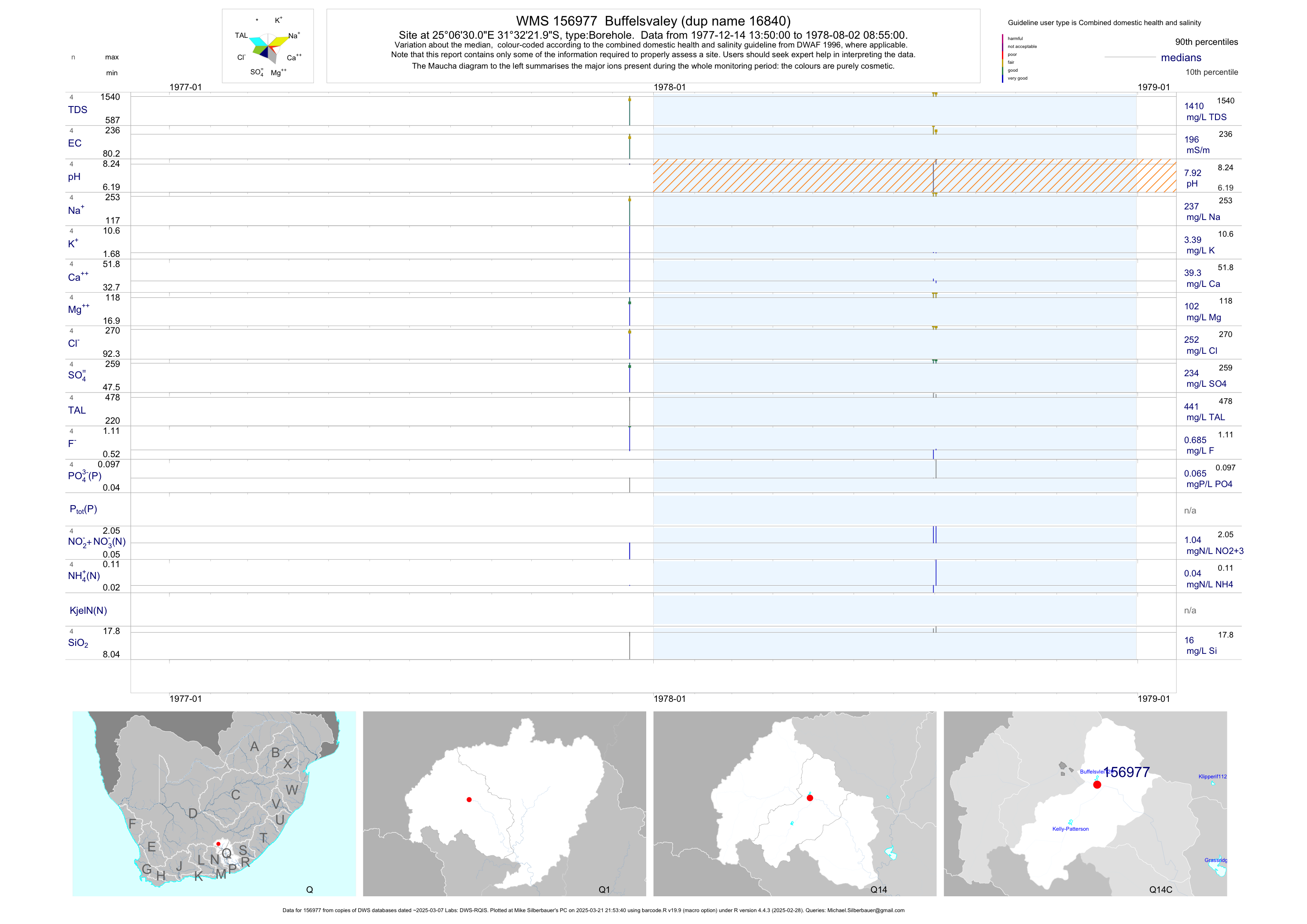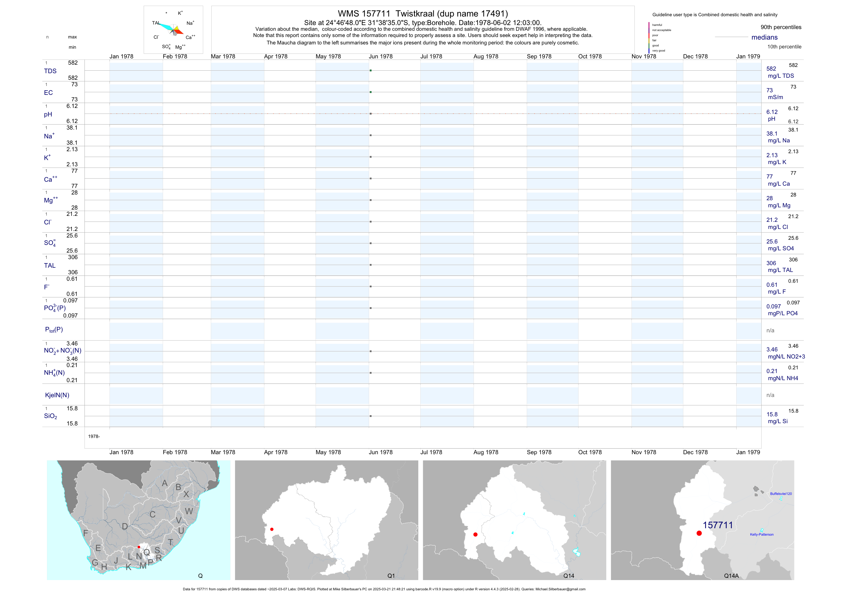 | Q14 157400 | plot | data | Grootfontein (dup name 17214) | Borehole | 1 | 1978-01-09 | 1978-01-09 | 102 | 157400 | -31.51806 | 25.05444 |