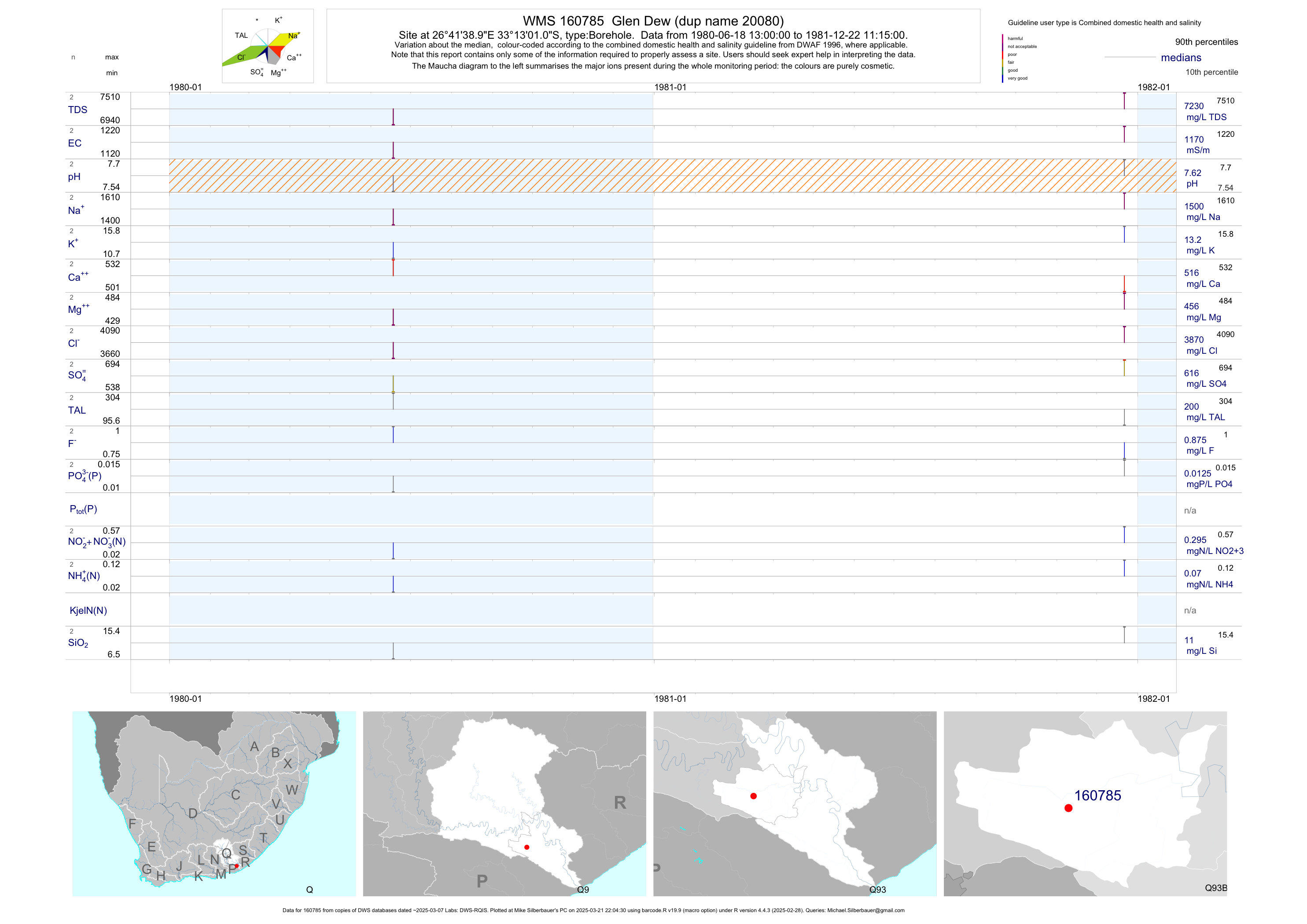 | Q93 160785 | plot | data | Glen Dew (dup name 20080) | Borehole | 2 | 1980-06-18 | 1981-12-22 | 1172 | 160785 | -33.21694 | 26.69417 |