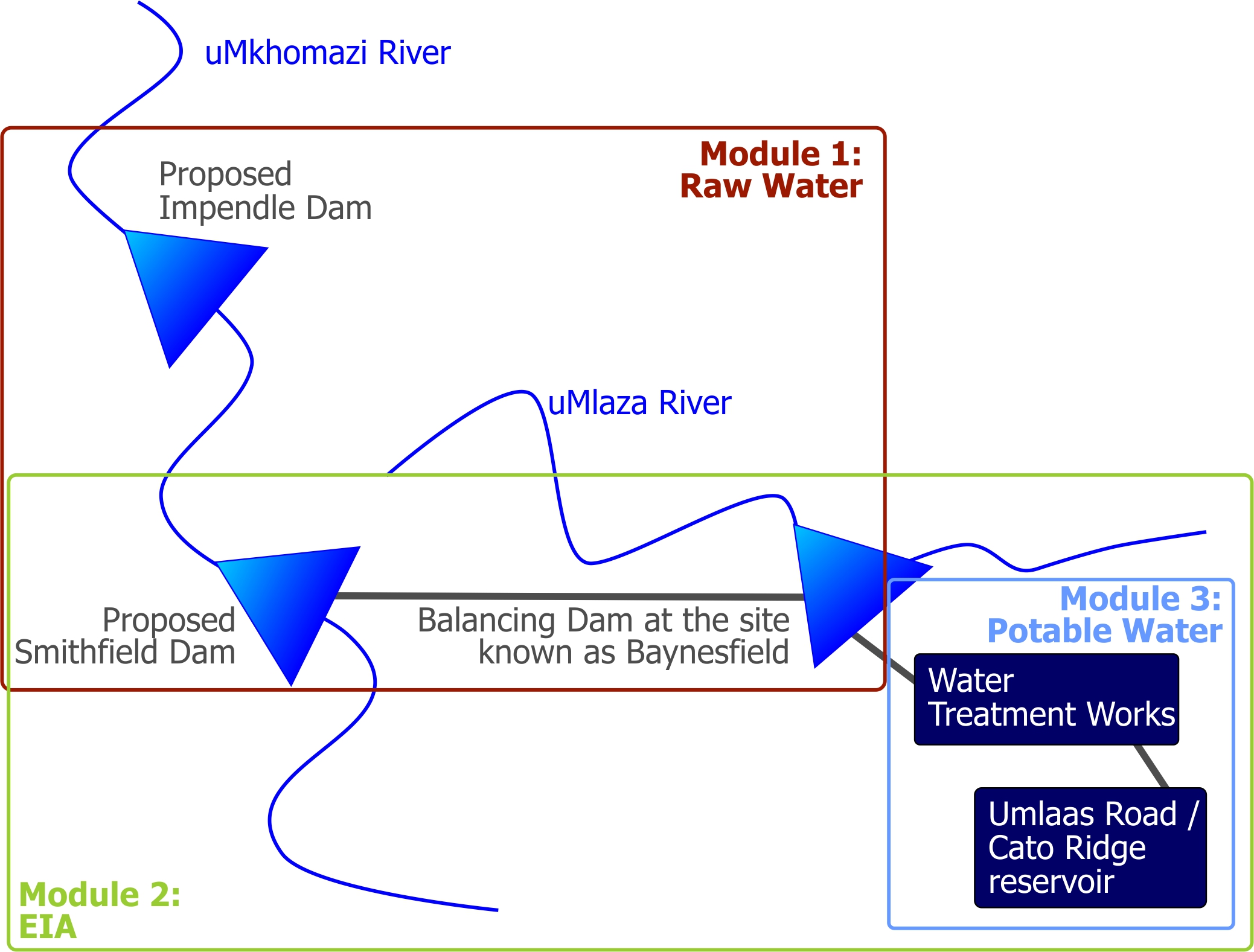 The Potable Water component will link in with Module 1 in the Baynesfield area. Raw water will be received from either a dam or raw water tunnel in the Baynesfield area. The raw water will be treated at a proposed water treatment works and conveyed to the Umlaas Road area via a system of potable water pipelines. The responsibilities of Module 3 are: